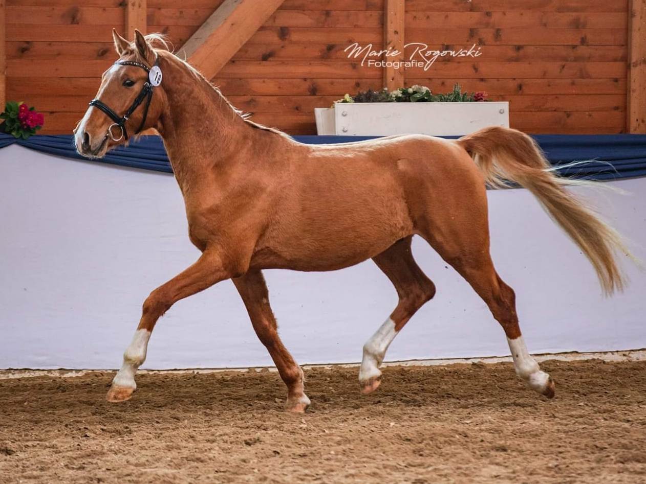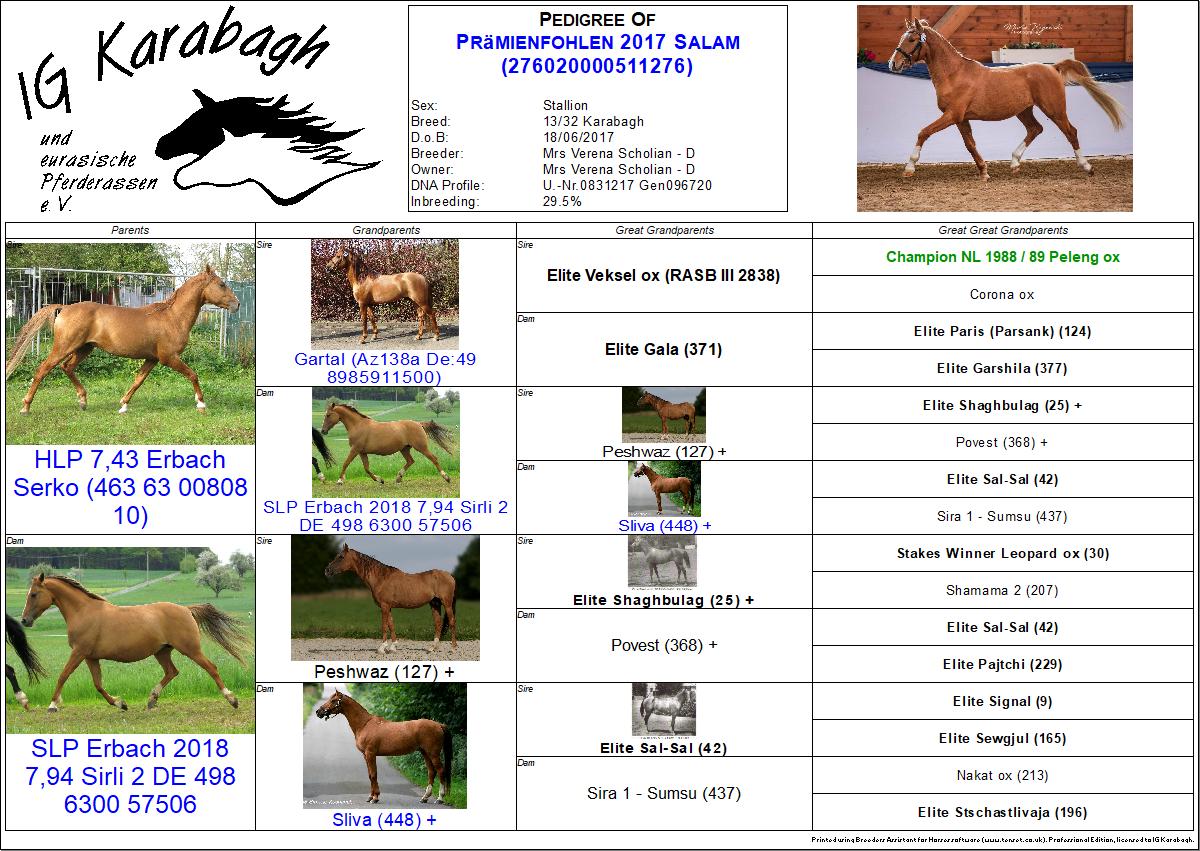 Karabaghhengst „Salam" *2017 goldfuchsfalb, HB II - Verband der Pony- und Pferdezüchter Hessen Trab 8 und Schritt 8 von 10 Punkten, ingezogen auf reinrassige Karabaghstute Sirli-Elite (Stutenleistungsprüfung: 7,94), alle Vorfahren in Aserbaidschan geboren. Salam zeigt alle Merkmale der