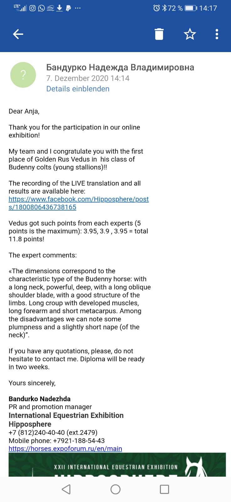 Vater: Golden Habitus - Gestüt: Zimonovski Russland, Mutter: Rus Rada - Züchter Roman Bulyga / (beide aus Russland importiert) Eltern und Vedus sind in Russland registriert.